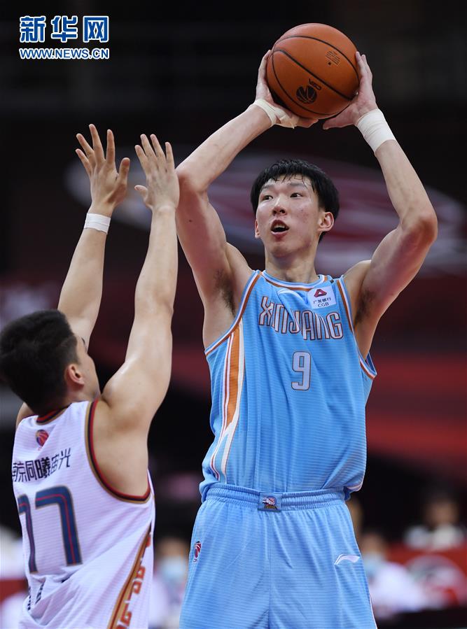 7月3日,新疆伊力特队球员周琦(右)在比赛中伺机传球。 当日,在山东青岛举行的2019-2020赛季中国男子篮球职业联赛(CBA)复赛第一阶段比赛中,新疆伊力特队以99比85战胜南京同曦宙光队。 新华社记者李紫恒摄