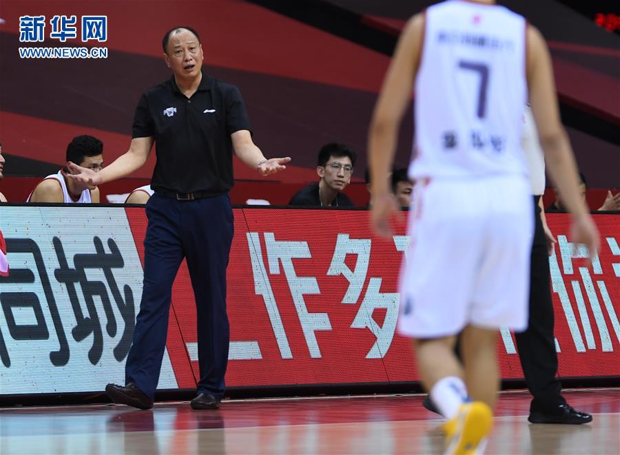 7月3日,南京同曦宙光队主教练崔万军(左)在场边指导队员。 当日,在山东青岛举行的2019-2020赛季中国男子篮球职业联赛(CBA)复赛第一阶段比赛中,新疆伊力特队以99比85战胜南京同曦宙光队。 新华社记者李紫恒摄