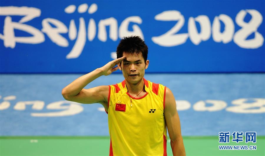 图为2008年8月17日,林丹在北京奥运会羽毛球男子单打决赛中战胜马来西亚选手李宗伟夺得冠军后向全场观众敬军礼。新华社记者罗更前摄