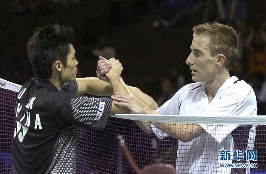 图为2005年8月20日,林丹(左)在美国阿纳海姆举行的第14届世界羽毛球锦标赛男子单打半决赛中战胜丹麦名将盖德后与其握手致意。 新华社记者戚恒摄