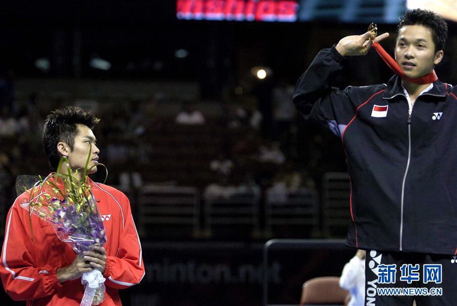图为2005年8月21日,林丹(左)和陶菲克在美国阿纳海姆举行的第14届世界羽毛球锦标赛男子单打颁奖仪式上。林丹在男子单打决赛中以0比2负于印度尼西亚选手陶菲克,获得男单亚军。 新华社记者戚恒摄