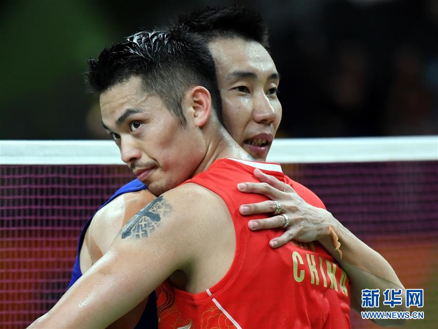 图为2016年8月19日,林丹(前)和李宗伟在里约奥运会羽毛球男子单打半决赛后拥抱致意。 新华社记者吕小炜摄