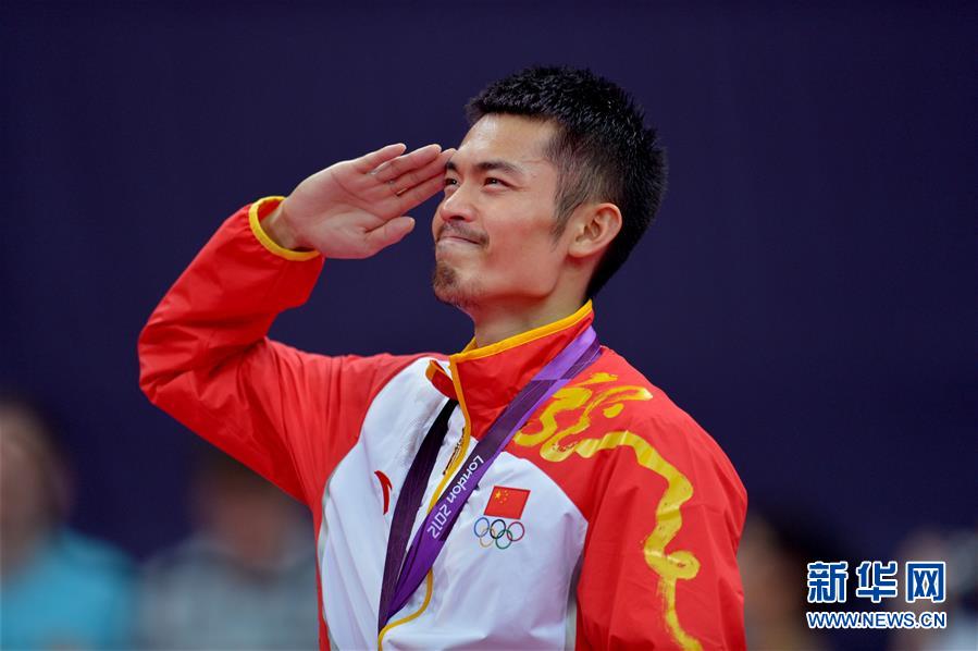 图为2012年8月5日,林丹在伦敦奥运会羽毛球男子单打决赛中战胜马来西亚选手李宗伟夺得冠军后在颁奖仪式上敬军礼。 新华社记者陈晓伟摄