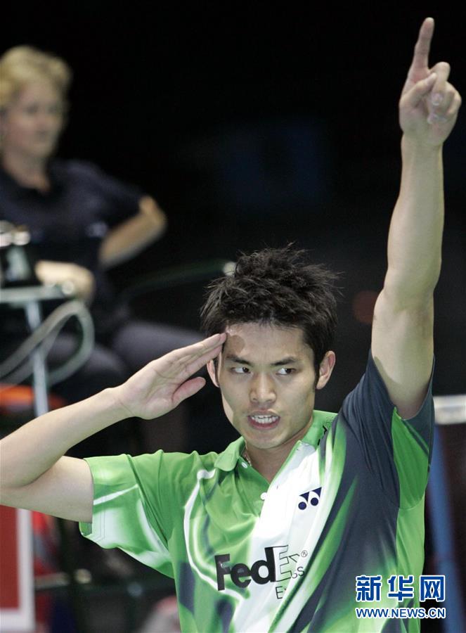 图为2006年9月24日,林丹在西班牙马德里举行的第15届世界羽毛球锦标赛男单决赛中夺冠后庆祝。 新华社记者张晨摄