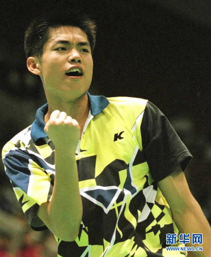 图为2000年11月6日,中国队选手林丹在世界青年羽毛球锦标赛混合团体赛决赛中为自己加油。最终,中国队以3比2战胜韩国队,夺得冠军。 新华社记者壮锦摄