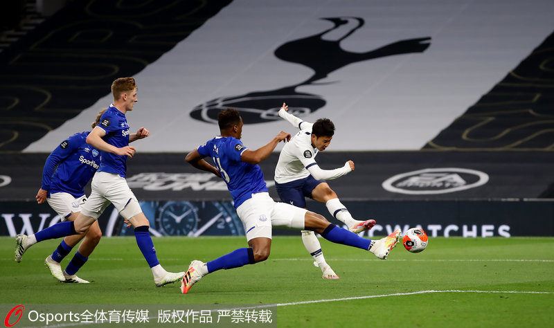第24分钟,孙兴慜带球突破后横传凯恩,凯恩左脚打门被封堵,禁区中路洛塞尔索得球转身抽射,皮球打在基恩身上发生折射飞入球门!热刺1-0埃弗顿。