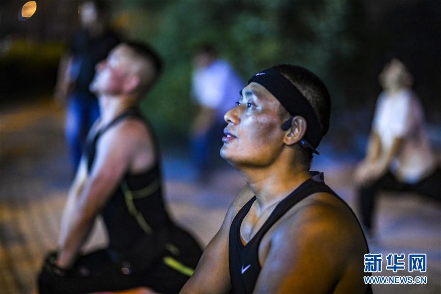 在新疆乌鲁木齐,雅山健跑团团长梁博(右)带领跑友们在夜跑后拉伸(2020年7月3日摄)。 (配本社同题文字稿) 新华社记者赵戈摄