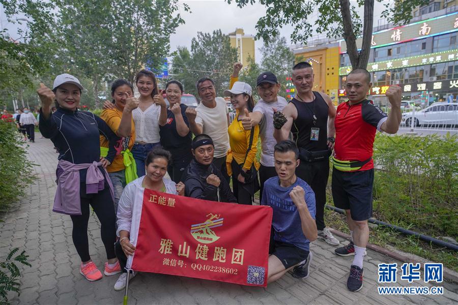 在新疆乌鲁木齐,雅山健跑团12名跑友在夜跑前合影(2020年7月3日摄)。 (配本社同题文字稿) 新华社记者赵戈摄