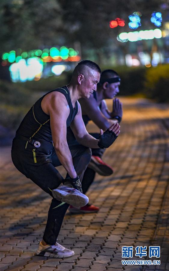 在新疆乌鲁木齐,雅山健跑团成员何绪成(左)在夜跑后拉伸(2020年7月3日摄)。 (配本社同题文字稿) 新华社记者赵戈摄