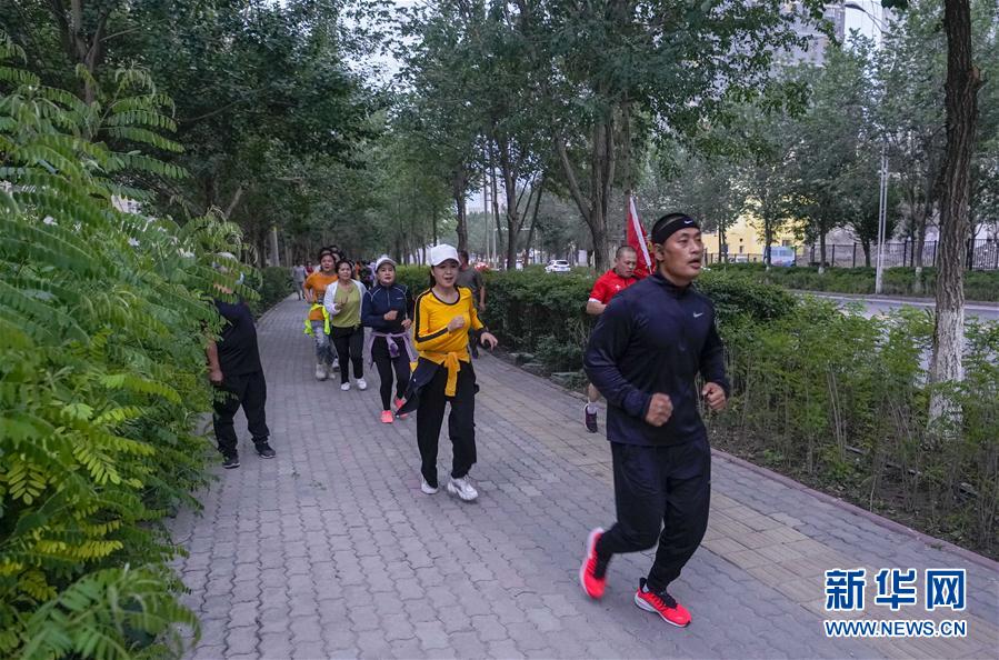 在新疆乌鲁木齐,雅山健跑团团长梁博(前)带领跑友们夜跑(2020年7月3日摄)。 (配本社同题文字稿) 新华社记者赵戈摄
