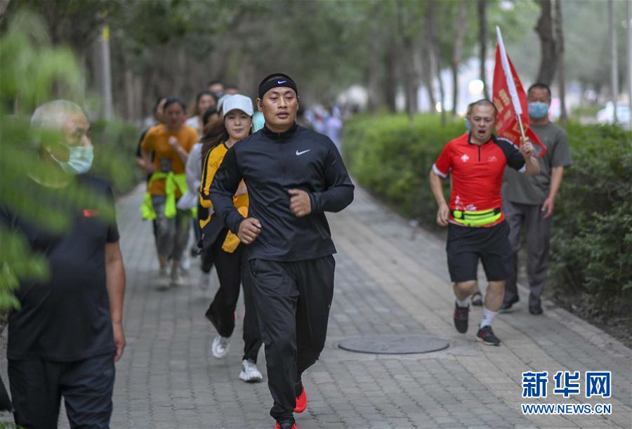 在新疆乌鲁木齐,雅山健跑团团长梁博(前)带领跑友们夜跑(2020年7月3日摄)。 (配本社同题文字稿) 新华社记者赵戈摄