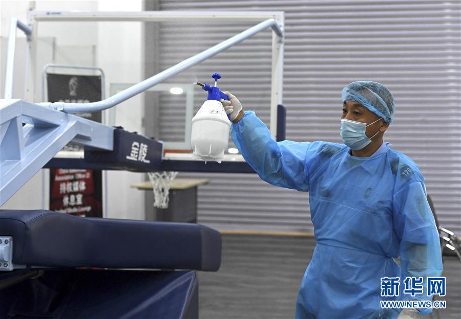 7月7日,一名卫生防疫人员在青岛市民健身中心体育馆内喷洒消毒液。 当日,2019-2020赛季中国男子篮球职业联赛(CBA)复赛进入第二阶段比赛。根据安排,复赛第二阶段比赛将在青岛国信体育中心钻石体育馆(崂山赛区)和青岛市民健身中心体育馆(红岛赛区)进行。 目前,红岛赛区各项准备工作已基本就绪,各球队按计划分别进行踩场适应性训练。红岛赛区首场比赛将于7月8日打响。 新华社记者朱峥摄