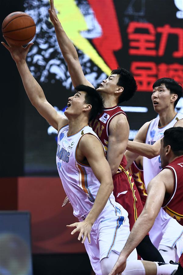 7月7日,新疆伊力特队球员俞长栋(左一)在比赛中上篮。 当日,在山东青岛举行的2019-2020赛季中国男子篮球职业联赛(CBA)复赛第二阶段(青岛崂山赛区)比赛中,新疆伊力特队对阵吉林九台农商银行队。 新华社记者郭绪雷摄