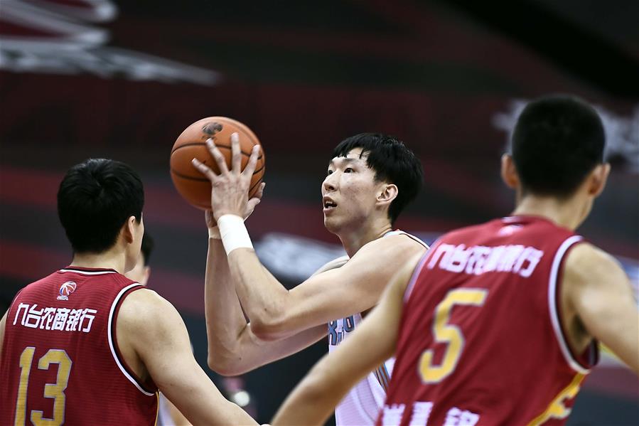 7月7日,新疆伊力特队球员周琦(中)在比赛中。 当日,在山东青岛举行的2019-2020赛季中国男子篮球职业联赛(CBA)复赛第二阶段(青岛崂山赛区)比赛中,新疆伊力特队对阵吉林九台农商银行队。 新华社记者郭绪雷摄