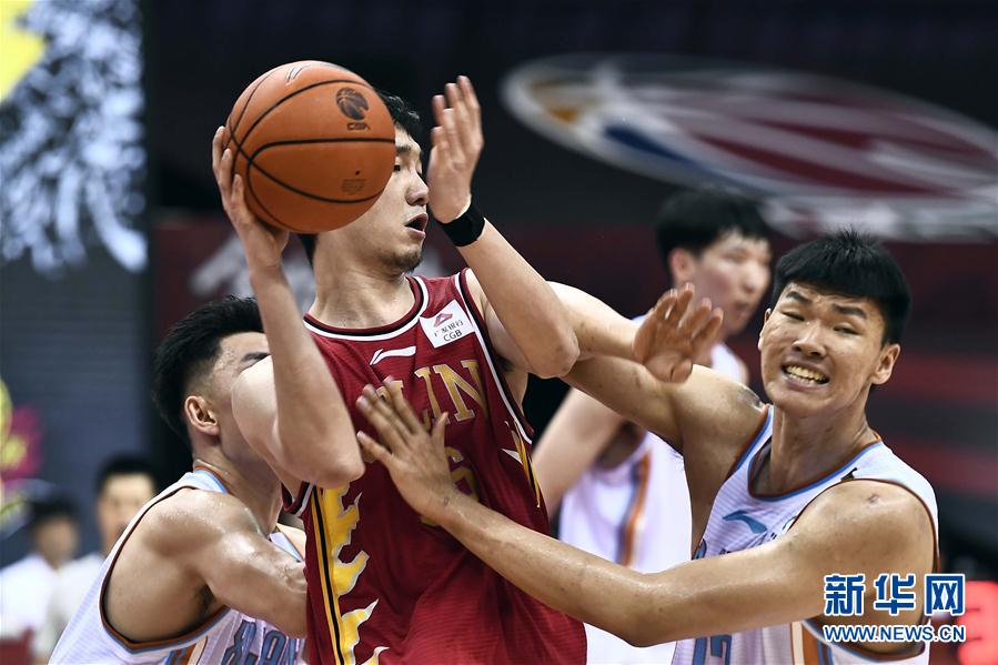 7月7日,吉林九台农商银行队球员代怀博(中)在比赛中拼抢。 当日,在山东青岛举行的2019-2020赛季中国男子篮球职业联赛(CBA)复赛第二阶段(青岛崂山赛区)比赛中,吉林九台农商银行队以105比106不敌新疆伊力特队。 新华社记者郭绪雷摄