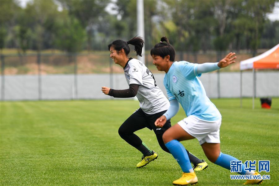 7月8日,内蒙古U17女子足球队队员崔若彤(左)和海日在折返跑训练中。 当日,内蒙古自治区U17男子、女子足球队在呼和浩特市青少年足球训练基地进行公开训练。在做好疫情防控工作的前提下,内蒙古自治区U17男子、女子足球队坚持训练,备战2021年全运会。 新华社记者贝赫摄
