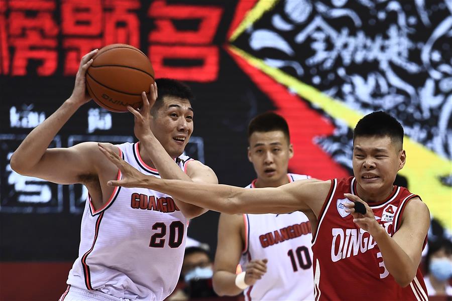 7月8日,广东东莞队球员任骏飞(左)在比赛中突破。 当日,在山东青岛举行的2019-2020赛季中国男子篮球职业联赛(CBA)复赛第二阶段(崂山赛区)比赛中,广东东莞银行队以114比111战胜青岛国信双星队。 新华社记者 郭绪雷 摄