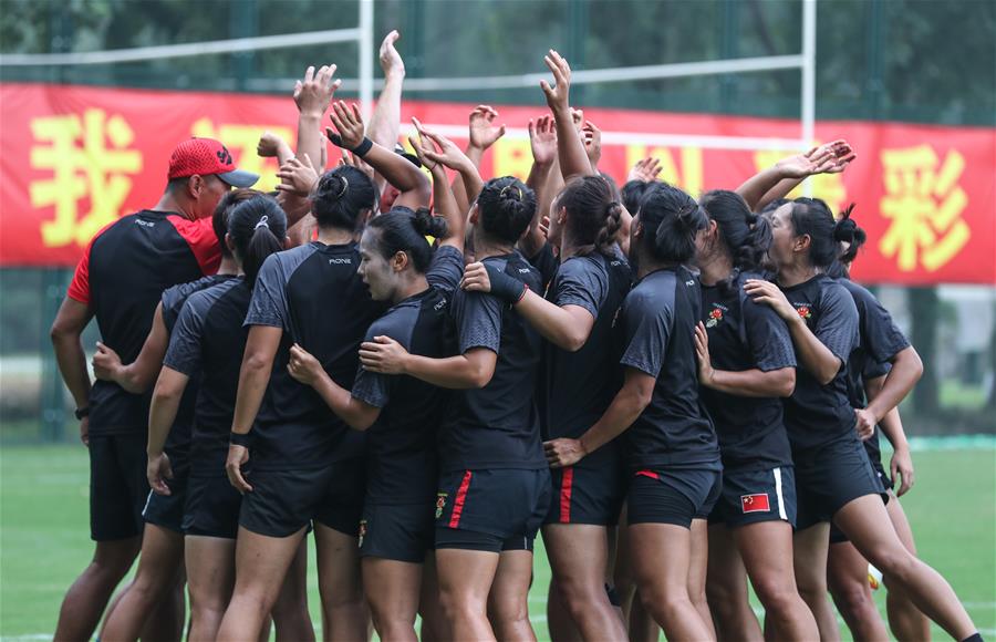 7月8日,中国女子橄榄球队队员们在比赛前互相鼓励。 当日,一场备战东京奥运会的模拟对抗赛在南京的江苏省江宁足球训练基地举行。在基地集训的中国女子橄榄球队以27比12战胜江苏男子橄榄球青年队。 新华社记者 杨磊 摄