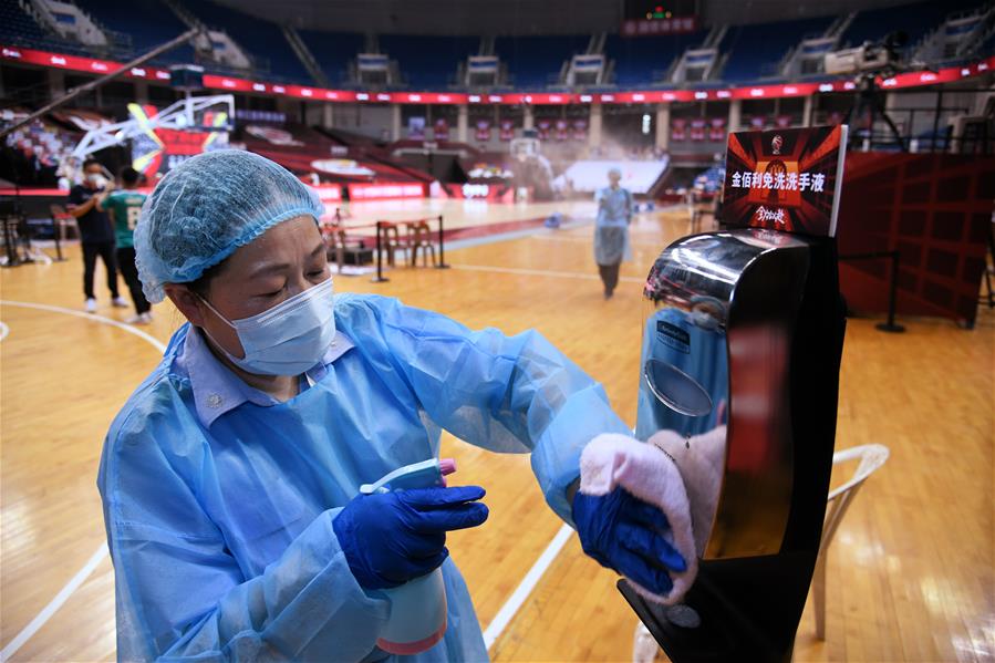 7月8日,在青岛国信体育馆内,一名防疫人员正在对洗手液容器进行消毒。 作为国内第一个重启的全国性大型体育赛事,CBA复赛意义非凡。CBA复赛第一阶段在安全、有序的环境下已经顺利完成,每一场比赛的背后,都凝聚着各方防疫人员辛勤的汗水,他们坚守在各自岗位上,为疫情防控特殊状态下赛事能顺利进行保驾护航。 新华社记者 李紫恒 摄