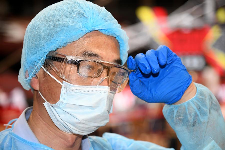 7月8日,在青岛国信体育馆内,防疫人员颜景滨在忙完工作后擦拭护目镜。 作为国内第一个重启的全国性大型体育赛事,CBA复赛意义非凡。CBA复赛第一阶段在安全、有序的环境下已经顺利完成,每一场比赛的背后,都凝聚着各方防疫人员辛勤的汗水,他们坚守在各自岗位上,为疫情防控特殊状态下赛事能顺利进行保驾护航。 新华社记者 李紫恒 摄