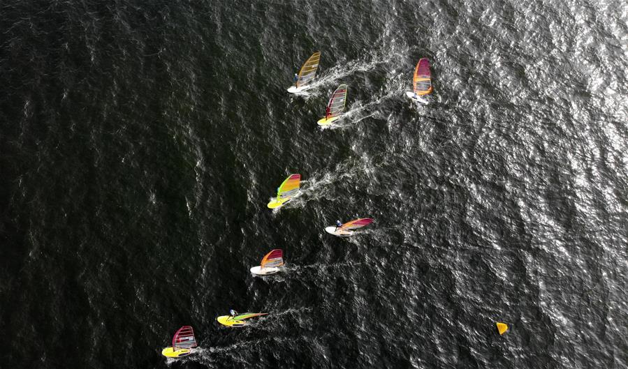 7月8日,四川省帆板队队员在训练中(无人机拍摄)。 日前,四川省帆板队在山东省日照市备战全运会。据了解,四川省帆板队25名队员自5月来到日照进行集训,预计将持续到10月。目前,共有四川和山东两省的帆船帆板队在日照集训。 新华社记者王凯摄