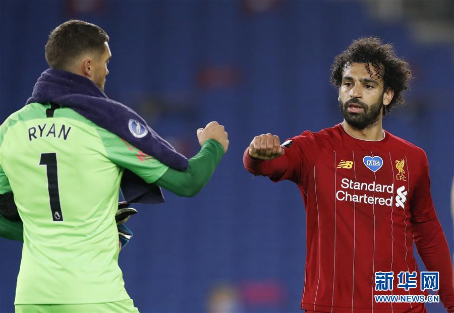 7月8日,利物浦队球员萨拉赫(右)赛后与布莱顿队门将瑞安致意。 当日,在2019-2020赛季英格兰足球超级联赛第34轮比赛中,利物浦队客场以3比1战胜布莱顿队。 新华社/路透