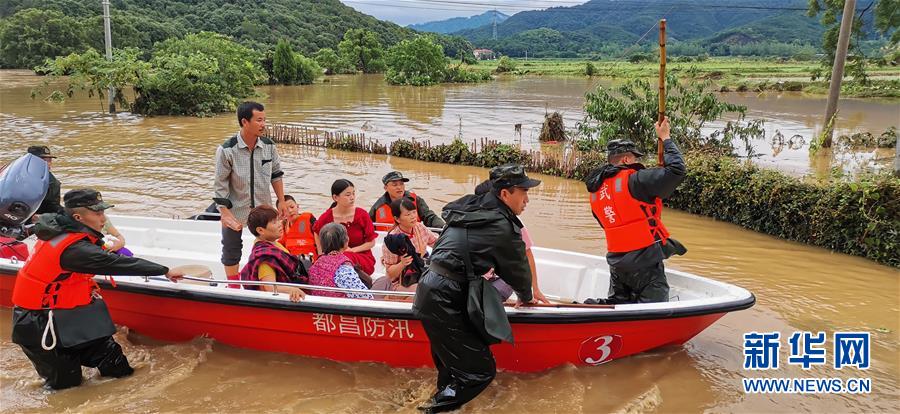 7月8日,武警江西省总队九江支队官兵在都昌县鸣山乡利用冲锋舟转移被洪水围困群众(手机拍摄)。新华社发(林天赐 摄)