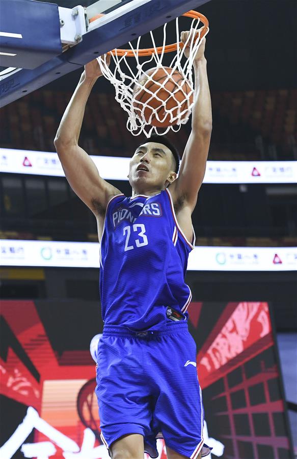 7月9日,天津先行者队球员时德帅在比赛中扣篮。 当日,在山东青岛举行的2019-2020赛季中国男子篮球职业联赛(CBA)复赛第二阶段(红岛赛区)比赛中,福建豹发力队以129比88战胜天津先行者队。 新华社记者朱峥摄