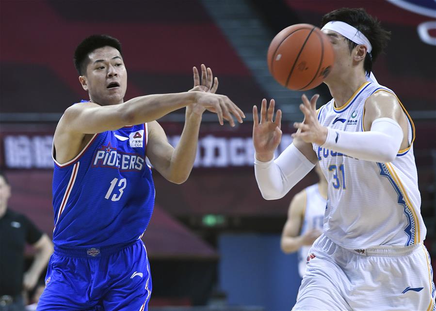 7月9日,天津先行者队球员张云梦(左)在比赛中传球。 当日,在山东青岛举行的2019-2020赛季中国男子篮球职业联赛(CBA)复赛第二阶段(红岛赛区)比赛中,福建豹发力队以129比88战胜天津先行者队。 新华社记者朱峥摄