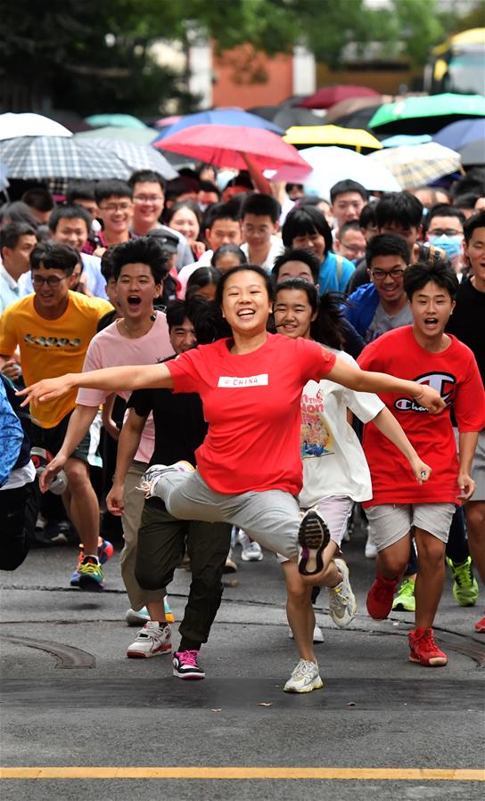 7月8日,高考结束,罗子欣(中)冲出长沙市一中考点大门后以“一字马”姿态跃起。 7月8日,长沙市第一中学高考考生罗子欣在高考结束后飞奔出考场大门,完成了两个健美操“一字马”动作。她的照片在网络广泛传播,引发网民热议。新华社发(郭立亮 摄)
