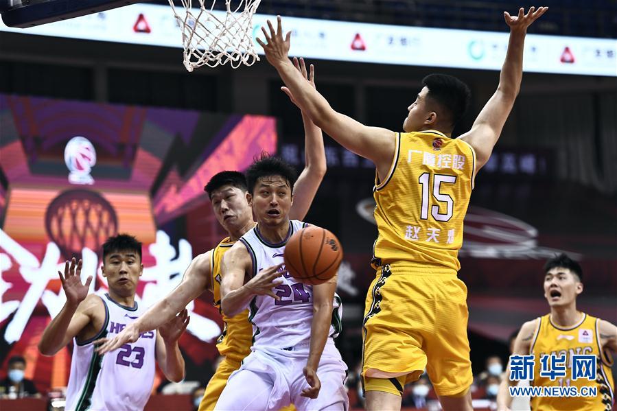 7月9日,山东西王队球员王汝恒(中)在比赛中传球。 当日,在山东青岛举行的2019-2020赛季中国男子篮球职业联赛(CBA)复赛第二阶段(崂山赛区)比赛中,浙江广厦控股队以100比84战胜山东西王队。 新华社记者郭绪雷摄