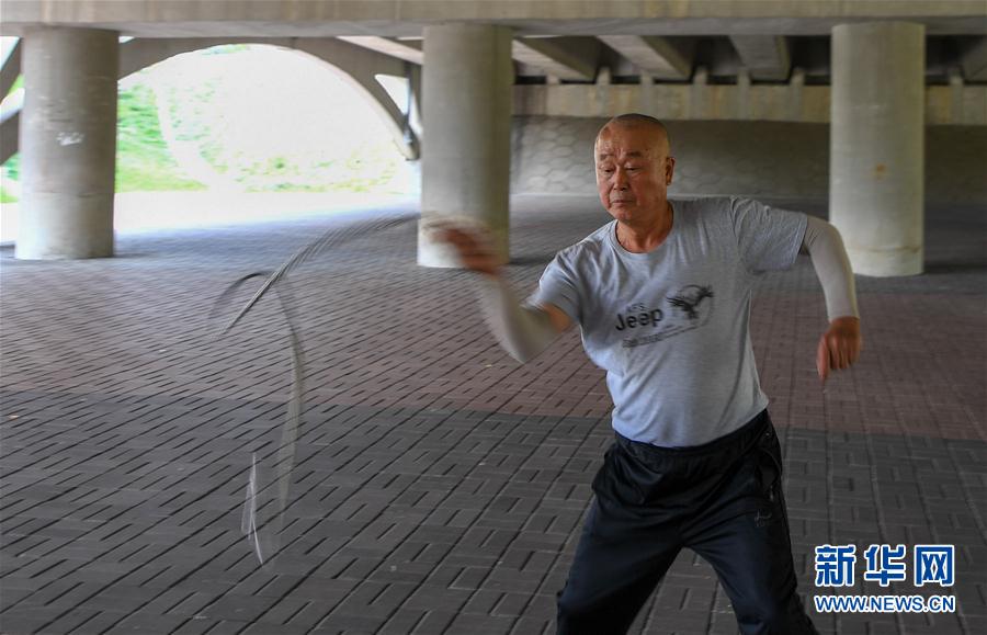 “桥洞甩鞭队”队员于海军展示甩鞭技艺(2020年7月9日摄)。 在长春市一匡桥的桥下,几十位市民挥舞长鞭啪啪作响,这是宽城区团山街道首山路社区“桥洞甩鞭队”在进行训练。甩鞭队有队员70余人,平均年龄超过60岁。他们每天在这里训练两个小时左右,已经坚持近三年时间。甩鞭是一种全身运动,需要全身肌肉协调用力,对锻炼肩颈尤其有好处。甩鞭运动虽好,但噪音偏大。为了不扰民,“桥洞甩鞭队”在社区的支持下选择一匡桥下的桥洞内训练。 “甩鞭让我们享受到运动的快乐,保持身心的健康,我们要一直坚持下去。”队长许红说。 新华社记者张楠摄