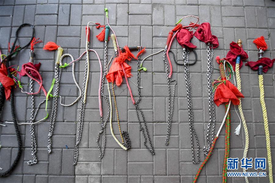 这是2020年7月9日拍摄“桥洞甩鞭队”队员使用的鞭子。 在长春市一匡桥的桥下,几十位市民挥舞长鞭啪啪作响,这是宽城区团山街道首山路社区“桥洞甩鞭队”在进行训练。甩鞭队有队员70余人,平均年龄超过60岁。他们每天在这里训练两个小时左右,已经坚持近三年时间。甩鞭是一种全身运动,需要全身肌肉协调用力,对锻炼肩颈尤其有好处。甩鞭运动虽好,但噪音偏大。为了不扰民,“桥洞甩鞭队”在社区的支持下选择一匡桥下的桥洞内训练。 “甩鞭让我们享受到运动的快乐,保持身心的健康,我们要一直坚持下去。”队长许红说。 新华社记者张楠摄