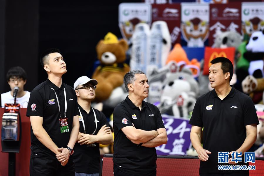 7月11日,辽宁本钢队教练组组长杨鸣与辽宁本钢队教练组成员在比赛前。 当日,在山东青岛举行的2019-2020赛季中国男子篮球职业联赛(CBA)复赛第二阶段(崂山赛区)比赛中,辽宁本钢队迎战山东西王队。 新华社记者郭绪雷摄
