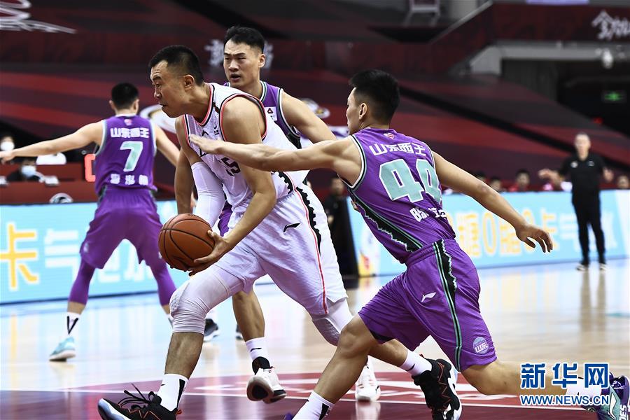 7月11日,辽宁本钢队球员韩德君(前左)在比赛中突破。 当日,在山东青岛举行的2019-2020赛季中国男子篮球职业联赛(CBA)复赛第二阶段(崂山赛区)比赛中,辽宁本钢队迎战山东西王队。 新华社记者郭绪雷摄