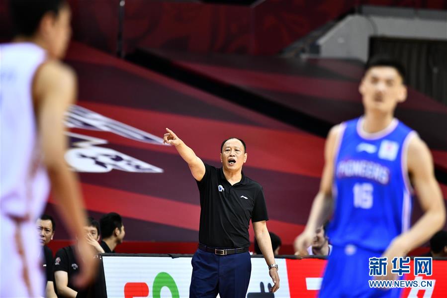 7月11日,南京同曦宙光队主教练崔万军(中)在场边指挥。 当日,在山东青岛举行的2019-2020赛季中国男子篮球职业联赛(CBA)复赛第二阶段(崂山赛区)比赛中,南京同曦宙光队以116比107战胜天津先行者队。 新华社记者郭绪雷摄