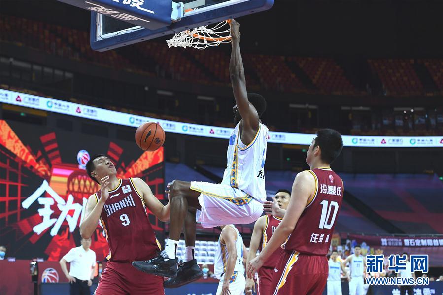 7月13日,北京首钢队尤度(中)在比赛中扣篮。 当日,在山东青岛举行的2019-2020赛季中国男子篮球职业联赛(CBA)复赛第二阶段(红岛赛区)比赛中,北京首钢队以111比91战胜山西汾酒股份队。 新华社记者 朱峥 摄