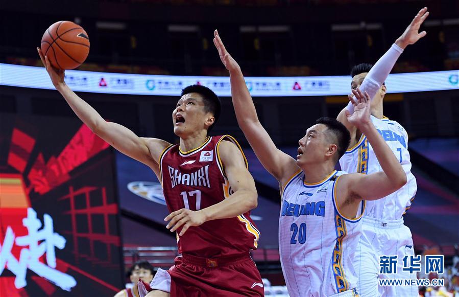 7月13日,山西汾酒股份队球员刘冠岑(左)在比赛中上篮。 当日,在山东青岛举行的2019-2020赛季中国男子篮球职业联赛(CBA)复赛第二阶段(红岛赛区)比赛中,北京首钢队以111比91战胜山西汾酒股份队。 新华社记者 朱峥 摄