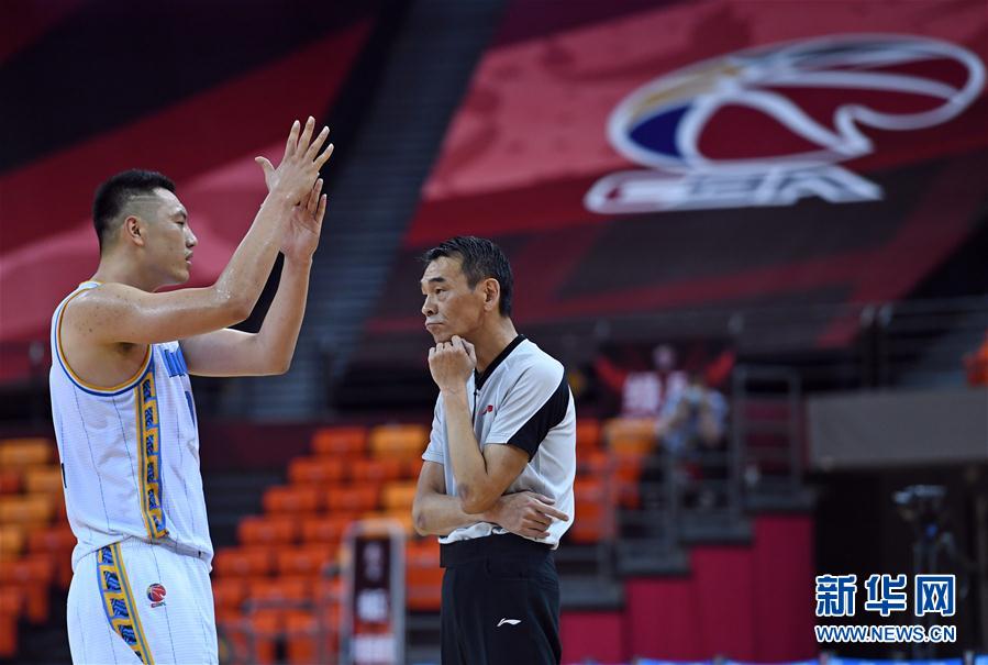 7月13日,主裁判梁斌(右)在比赛中听取北京首钢队球员翟晓川的申诉。 当日,在山东青岛举行的2019-2020赛季中国男子篮球职业联赛(CBA)复赛第二阶段(红岛赛区)比赛中,北京首钢队以111比91战胜山西汾酒股份队。 新华社记者 朱峥 摄