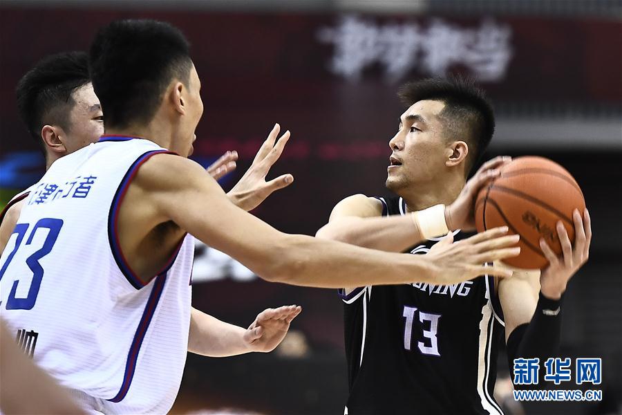 7月13日,辽宁本钢队球员郭艾伦(右)在比赛中持球进攻。 当日,在山东青岛举行的2019-2020赛季中国男子篮球职业联赛(CBA)复赛第二阶段(崂山赛区)比赛中,辽宁本钢队以133比78战胜天津先行者队。 新华社记者 郭绪雷 摄