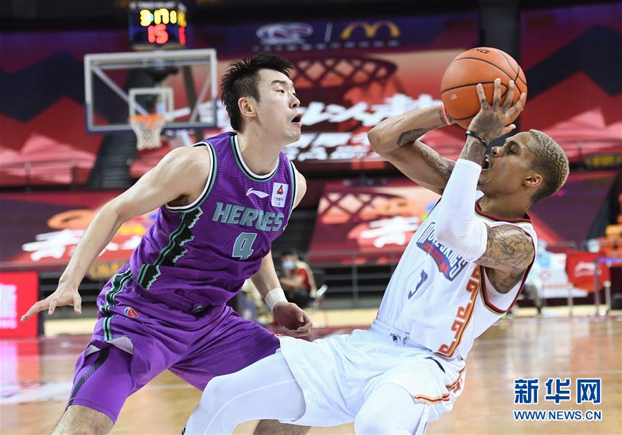 7月13日,山东西王队球员张辉(左)在比赛中防守南京同曦宙光队球员约瑟夫·杨。 当日,在山东青岛举行的2019-2020赛季中国男子篮球职业联赛(CBA)复赛第二阶段(红岛赛区)比赛中,山东西王队以125比110战胜南京同曦宙光队。 新华社记者 朱峥 摄