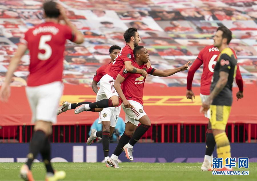 7月13日,曼联队球员马夏尔(右三)进球后与队友庆祝。 当日,在2019-2020赛季英格兰足球超级联赛第35轮比赛中,曼联队主场以2比2战平南安普敦队。 新华社发