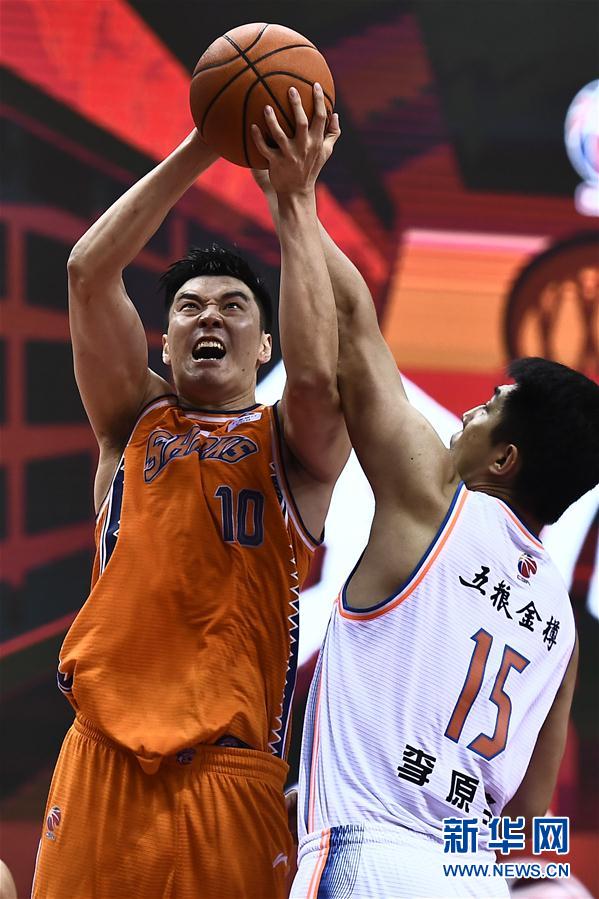 7月14日,上海久事队球员董瀚麟(左)在比赛中进攻。 当日,在山东青岛举行的2019-2020赛季中国男子篮球职业联赛(CBA)复赛第二阶段(崂山赛区)比赛中,上海久事队以88比78战胜四川五粮金樽队。 新华社记者 郭绪雷 摄