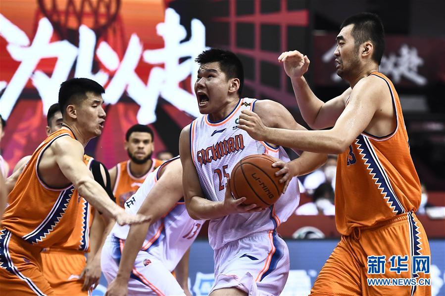 7月14日,四川五粮金樽队球员袁振梁(右二)在比赛中进攻。 当日,在山东青岛举行的2019-2020赛季中国男子篮球职业联赛(CBA)复赛第二阶段(崂山赛区)比赛中,上海久事队以88比78战胜四川五粮金樽队。 新华社记者 郭绪雷 摄