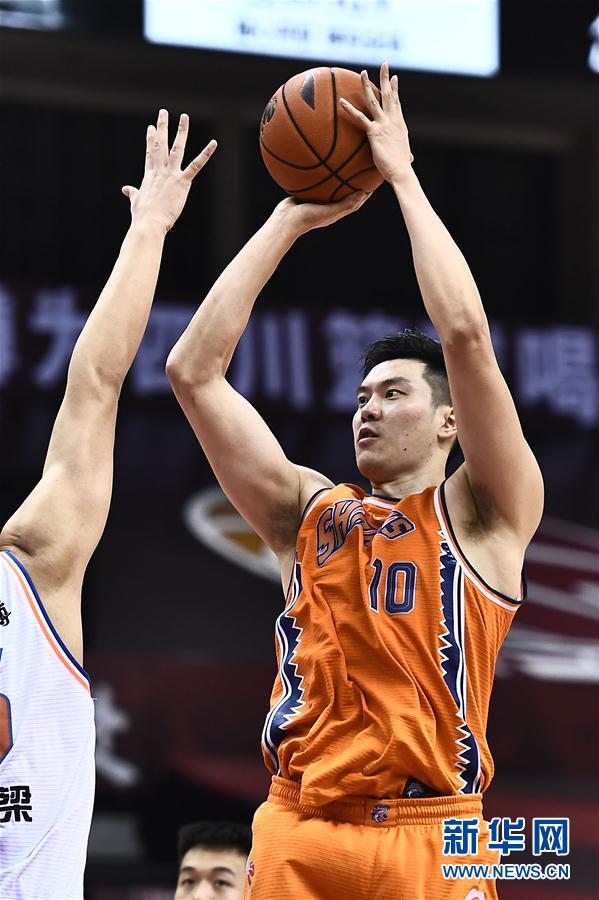 7月14日,上海久事队球员董瀚麟在比赛中投篮。 当日,在山东青岛举行的2019-2020赛季中国男子篮球职业联赛(CBA)复赛第二阶段(崂山赛区)比赛中,上海久事队以88比78战胜四川五粮金樽队。 新华社记者 郭绪雷 摄