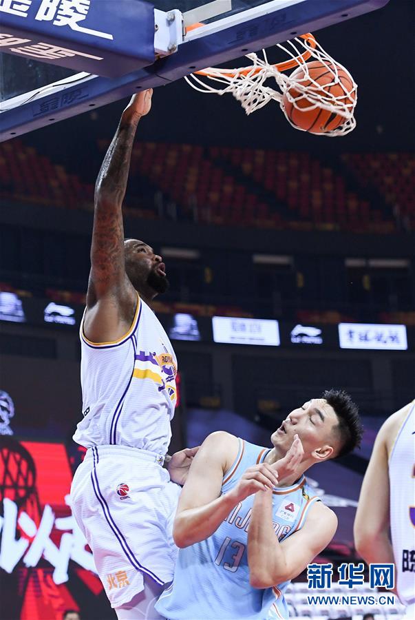 7月15日,北京控股队球员摩尔特里(左)在比赛中扣篮。 当日,在山东青岛举行的2019-2020赛季中国男子篮球职业联赛(CBA)复赛第二阶段(红岛赛区)比赛中,北京控股队对阵新疆伊力特队。 新华社记者 朱峥 摄