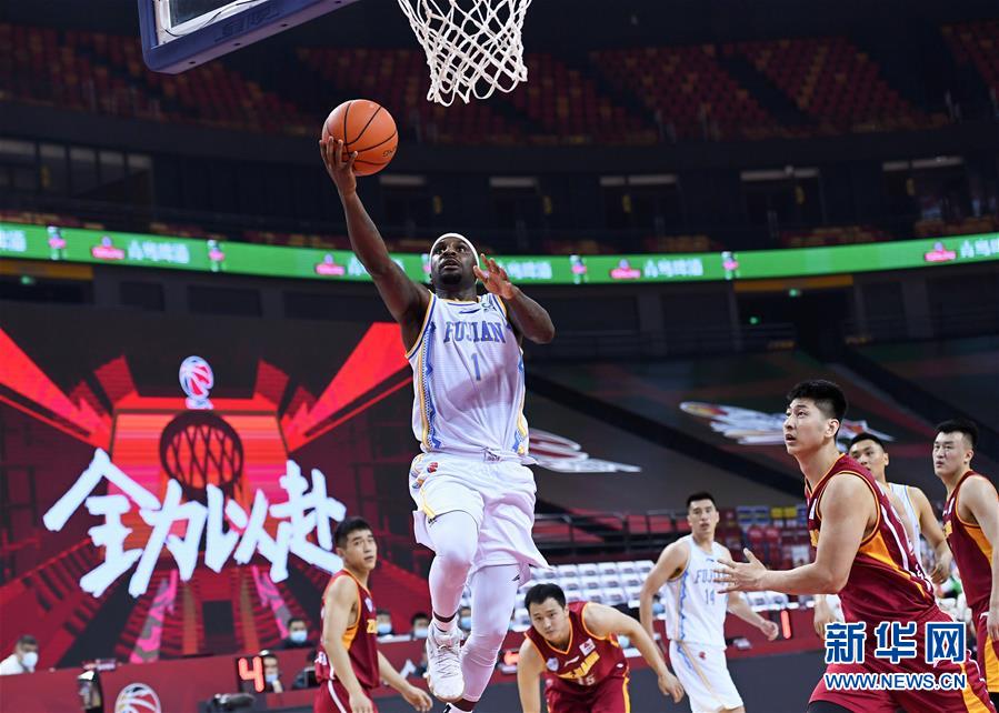7月15日,福建豹发力队球员劳森(上)在比赛中上篮。 当日,在山东青岛举行的2019-2020赛季中国男子篮球职业联赛(CBA)复赛第二阶段(红岛赛区)比赛中,浙江稠州银行队以136比107战胜福建豹发力队。 新华社记者 朱峥 摄