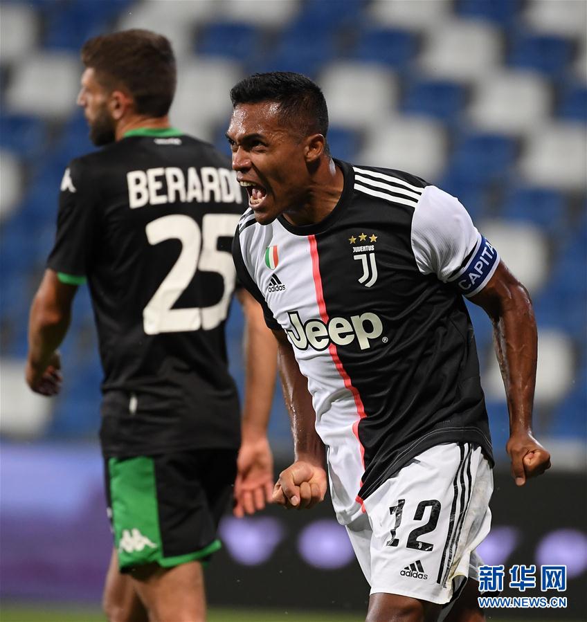 7月15日,尤文图斯队球员桑德罗(右)进球后庆祝。 当日,在2019-2020赛季意大利足球甲级联赛第33轮比赛中,尤文图斯队客场以3比3战平萨索洛队。 新华社发(阿尔贝托·林格利亚摄)