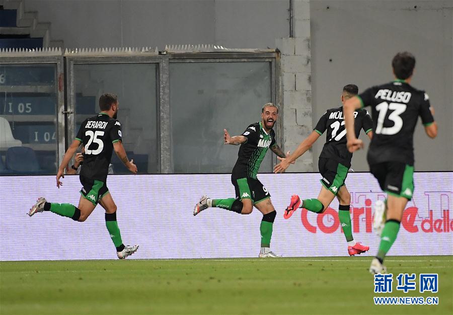 7月15日,萨索洛队球员卡普托(左二)进球后庆祝。 当日,在2019-2020赛季意大利足球甲级联赛第33轮比赛中,尤文图斯队客场以3比3战平萨索洛队。 新华社发(阿尔贝托·林格利亚摄)