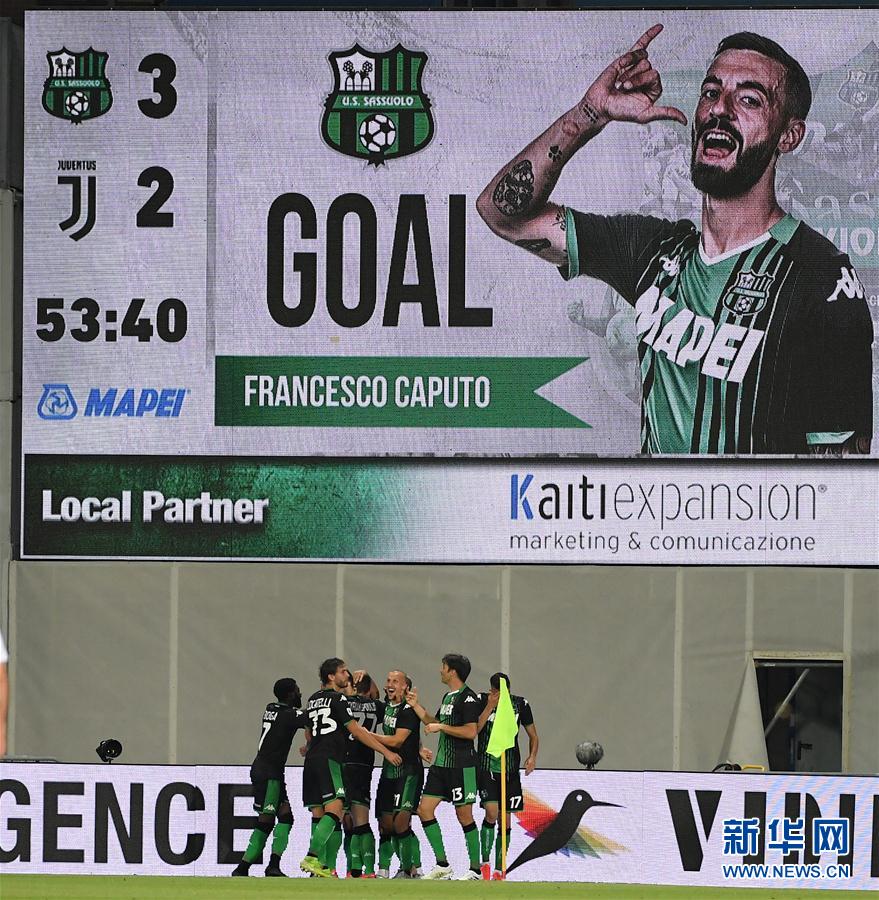 7月15日,萨索洛队球员庆祝队友卡普托的进球。 当日,在2019-2020赛季意大利足球甲级联赛第33轮比赛中,尤文图斯队客场以3比3战平萨索洛队。 新华社发(阿尔贝托·林格利亚摄)
